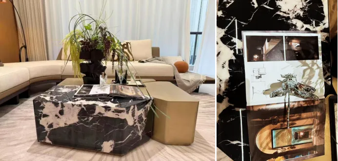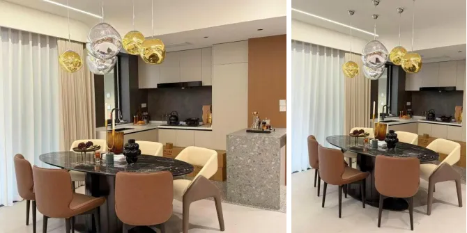 餐厅区域鹅蛋形大理石餐桌以柔和的弧线消解棱角,天然石材的高级质感与整体风格相得益彰,搭配咖色皮质餐椅,柔软的触感平衡了大理石的冷冽。上方悬挂的艺术吊灯,以简约的金属线条与温润的灯光,勾勒出用餐区的浪漫氛围,与客餐厅的木石基调形成巧妙呼应,让浪漫感在空间中自然流淌。