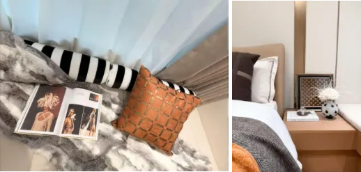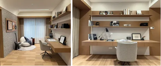 窗边的飘窗设计将胡桃木从窗台延伸至墙面,暗藏式窗帘盒搭配柔光系统,午后阳光透过纱帘洒落,在这里读书、观景,或是单纯放空,都是难得的惬意时光。