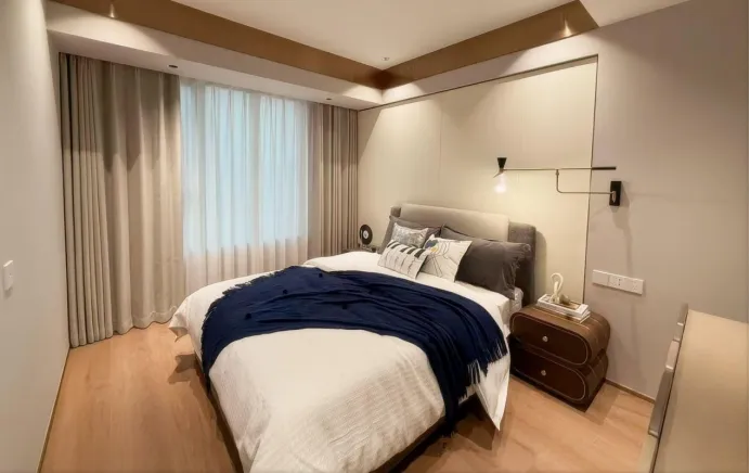老人房以舒适为核心,胡桃木色的点缀让空间更显沉稳温润。空间布局简洁流畅,无过多冗余装饰,营造出宁静祥和的休憩氛围。