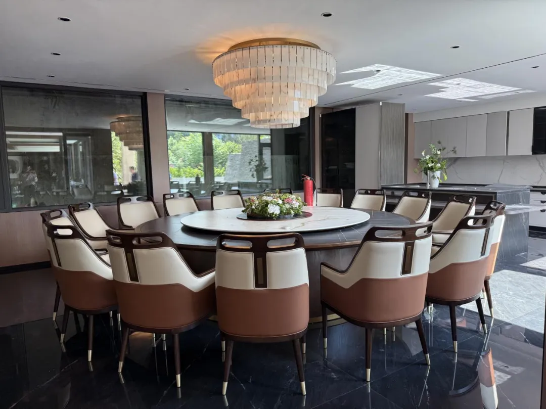餐厅选用皮质和实木结合彰显雅致大气,三米圆形大理石电动餐桌象征团圆,增添绿植的自然气息,灯光柔和营造温馨用餐氛围。