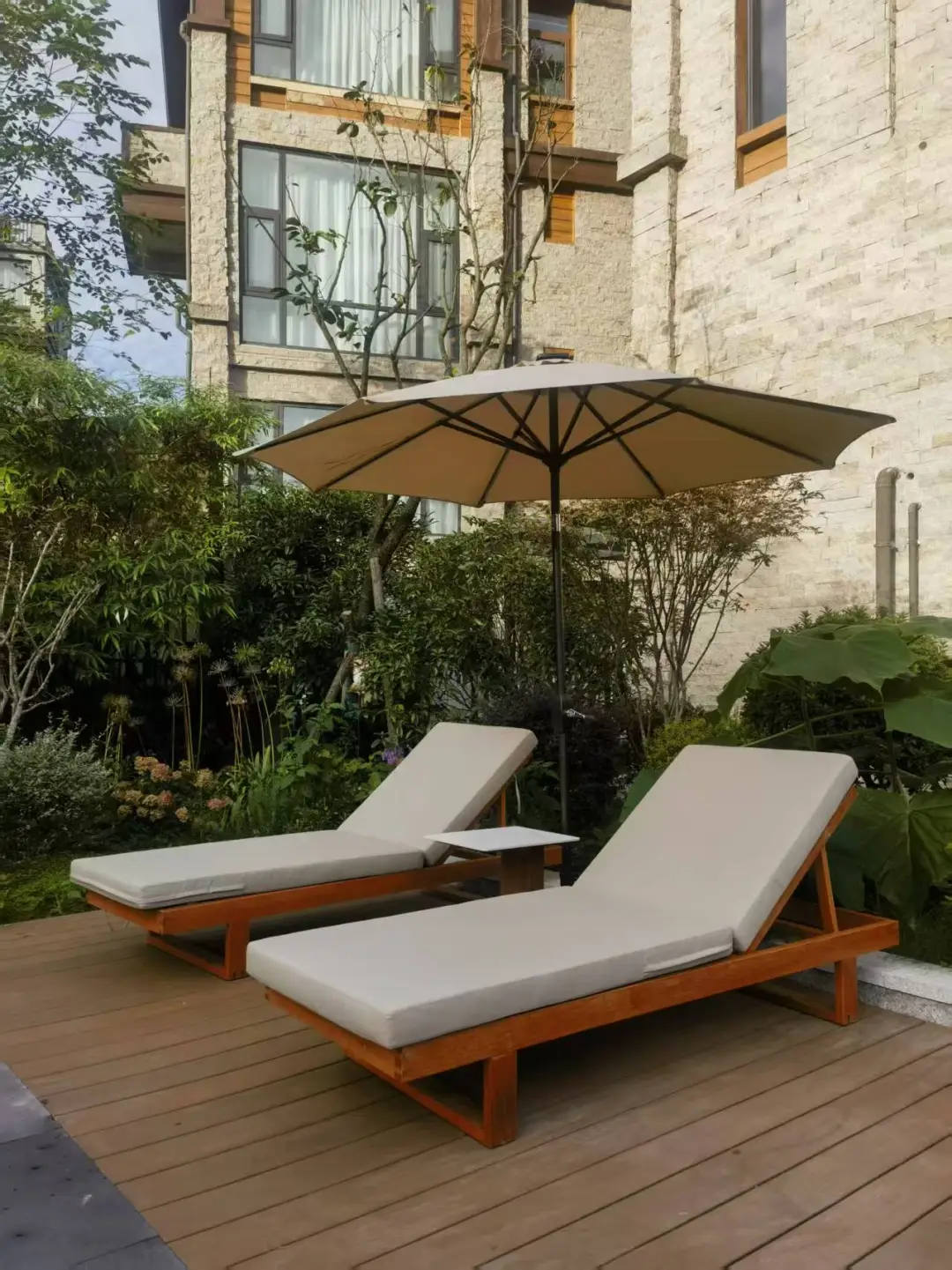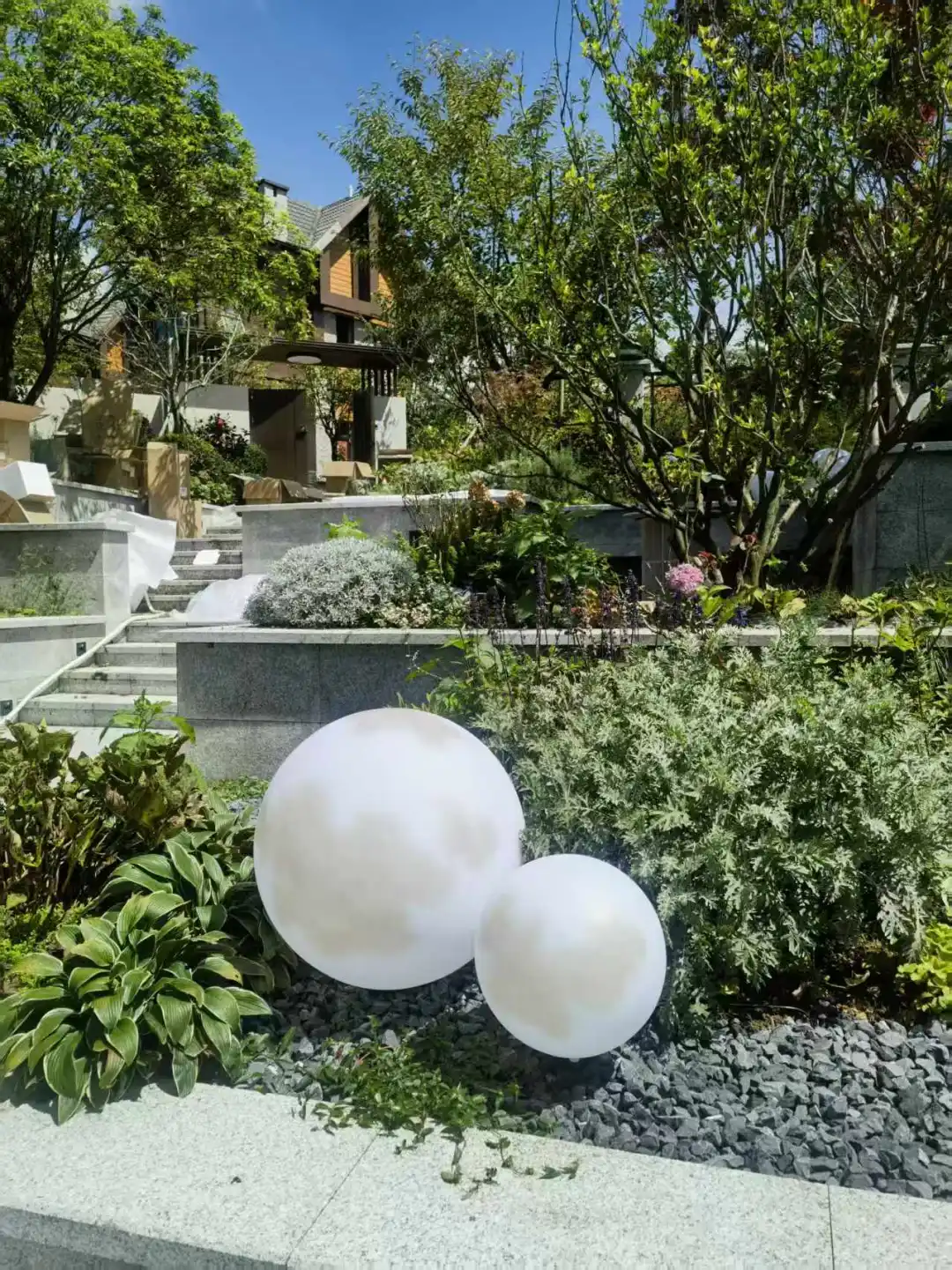 阳光露台,木椅灰伞,与自然绿意对望。庭院深深,白球石径,通往一方静谧天地。
