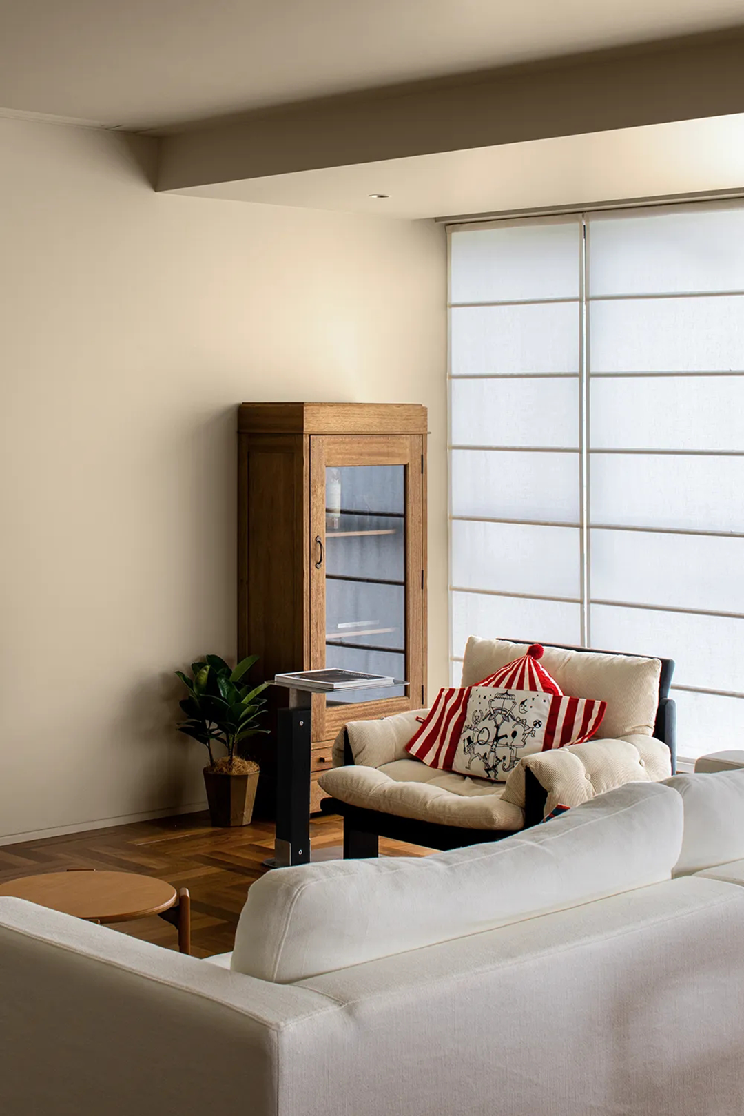 客厅空间设计主调为统一的杏色,覆盖墙面与天花,奠定简洁大气的风格。地面采用深色木地板与浅色拼接,形成视觉上的跳跃与平衡。同色系的软装搭配,如亚麻窗帘与沙发,通过材质的粗细纹理对比,在细节中提升了空间设计的温度,最终营造出一种让人心境平和的居住氛围。